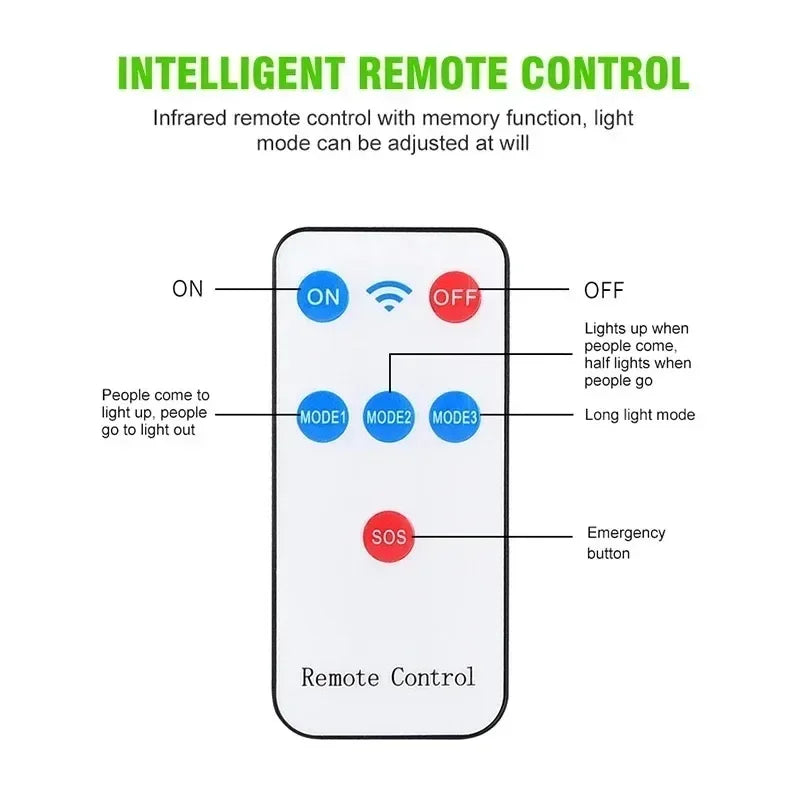 ※ 3 modos, detecção de corpo humano + controle remoto, faixa de diâmetro de detecção de 5 a 10 metros.Você pode usar o controle remoto para ligar e desligar as luzes e alternar os modos num alcance de 8 a 10 metros.