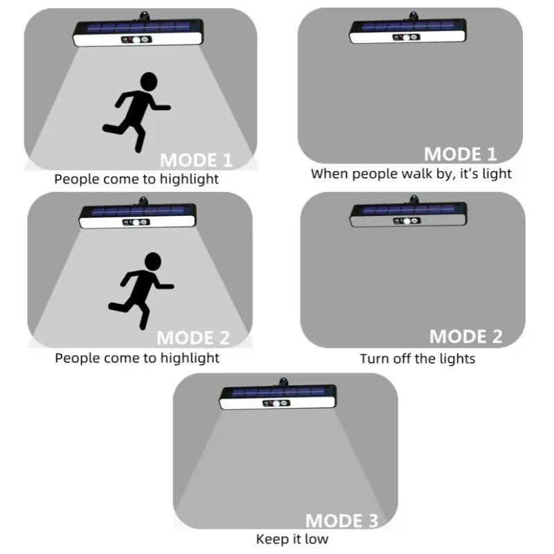 - Engrenagem: 3 modos (modo liga/desliga: quando as pessoas chegam, a luz acende.Quando as pessoas vão, as luzes se apagam no escuro; modo de luz fraca: quando as pessoas chegam, as luzes acendem.As pessoas desaparecem, as luzes são fracas no escuro; modo constante: as pessoas vêm e vão, as luzes estão sempre acesas no escuro.)